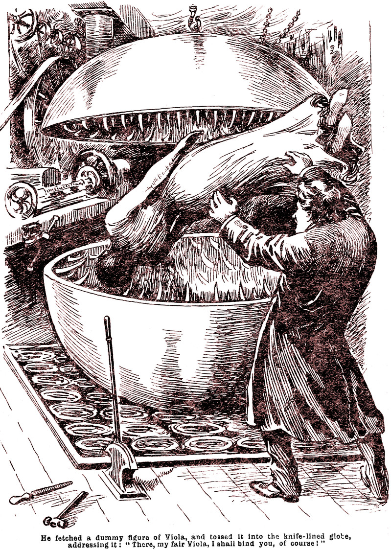 "He fetched a dummy figure of Viola, and tossed it into the knife-lined globe, addressing it: 'There, my fair Viola, I shall bind you, of course!'" From Thrilling Life Stories for the Masses, 1892.