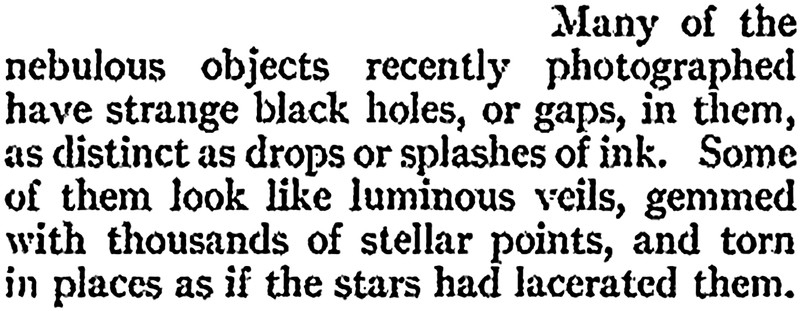 Tears in the fabric of space, described in Cosmopolitan, 1912. "Many of the nebulous objects recently photographed have strange black holes, or gaps, in them, as distinct as drops or splashes of ink. Some of them look like luminous veils, gemmed with thousands of stellar points, and torn in places as if the stars had lacerated them."