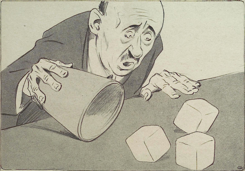 From Kladderadatsch, 1938. For the secret of why to roll blank dice, see Astragalomancy: A Loaded Guide: Intriguing Readings of 21 Discrete Dice Throws. By the way, in his novel Bury Me Among the Graves, Tim Powers describes organized dice rolling without looking at the numbers: "The old dwarf tossed the objects to the floor, and Crawford saw that they were dice. McKee turned and caught Crawford's chin in her hand. 'Don't look at the numbers on them,' she said. 'But if you want to be helpful, you could pick them up and throw them, over and over again. Not looking, remember.' ... As he dropped the dice one more time onto the floor, it occurred to Crawford that he had been hearing this repetitive rattle ever since they had entered this chamber. Were these dice thrown perpetually, their numbers never read? Chuchuwee must employ a relay of children to keep it up."