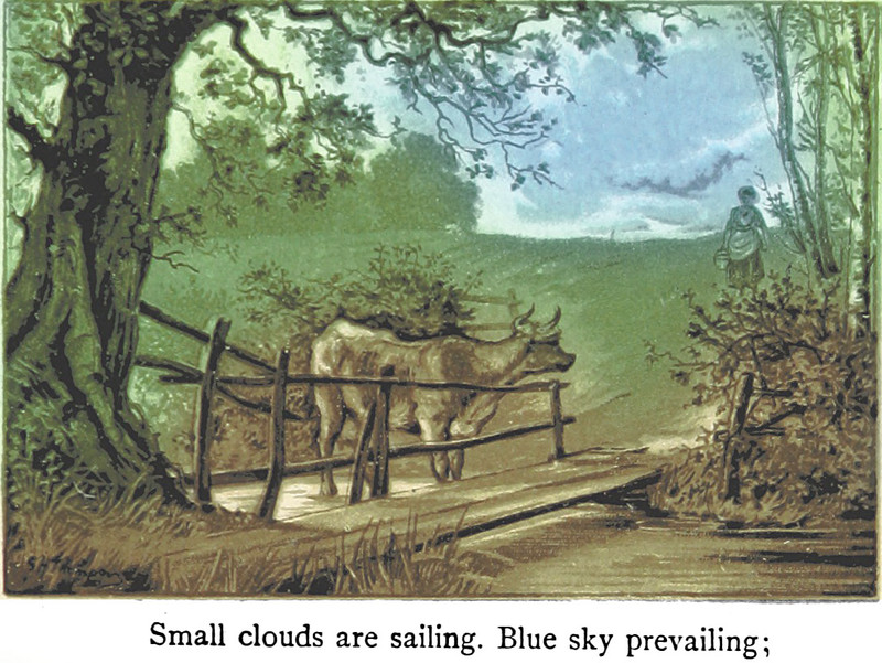 An illustration from Through the Year (1887).  The caption reads: "Small clouds are sailing.  Blue sky prevailing."