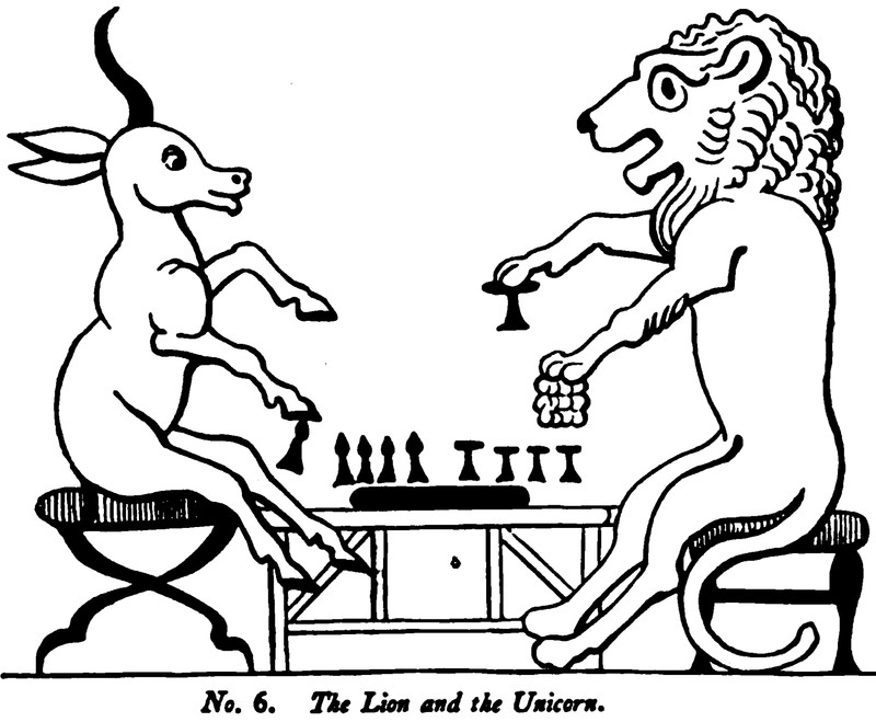 "The lion and the unicorn."  From A History of Caricature and Grotesque in Literature and Art by Thomas Wright, 1875.  This should be of interest: A Field Guide to Identifying Unicorns by Sound.