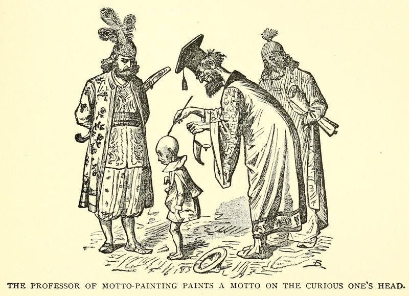 "The Professor of Motto-painting paints a motto on the curious one's head."  From The Floating Prince and Other Fairy Tales by Frank R. Stockton, 1930.
