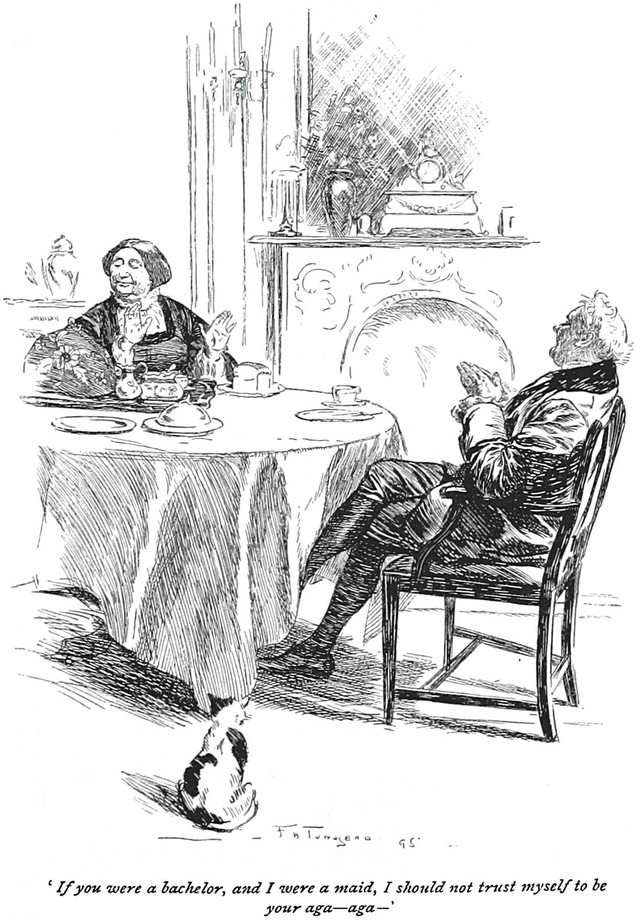 Here's a precursor to the Bonnie Tyler song 'If You Were a Woman (And I Was a Man),' from Gryll Grange by Thomas Love Peacock (1896).  The caption reads: "If you were a bachelor, and I were a maid, I should not trust myself to be your aga—aga—."