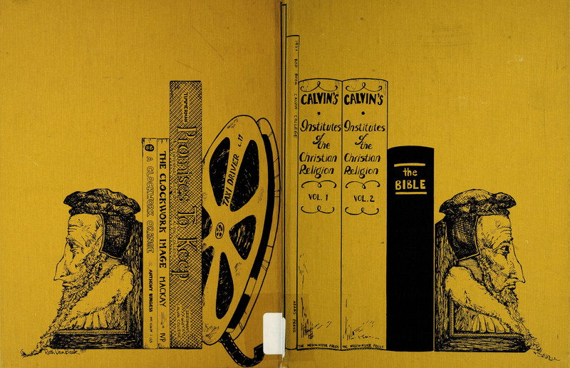 A cute concept -- though the spine of this yearbook wasn't scanned, it would be one of the books on the shelf when the covers were opened fully. From Calvin College's 1978 yearbook.