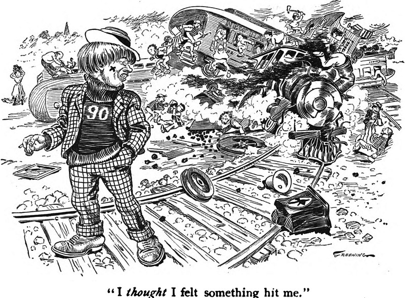 #vintage illustration #train wreck #illustration #bounced off him #barely a scratch #unscathed