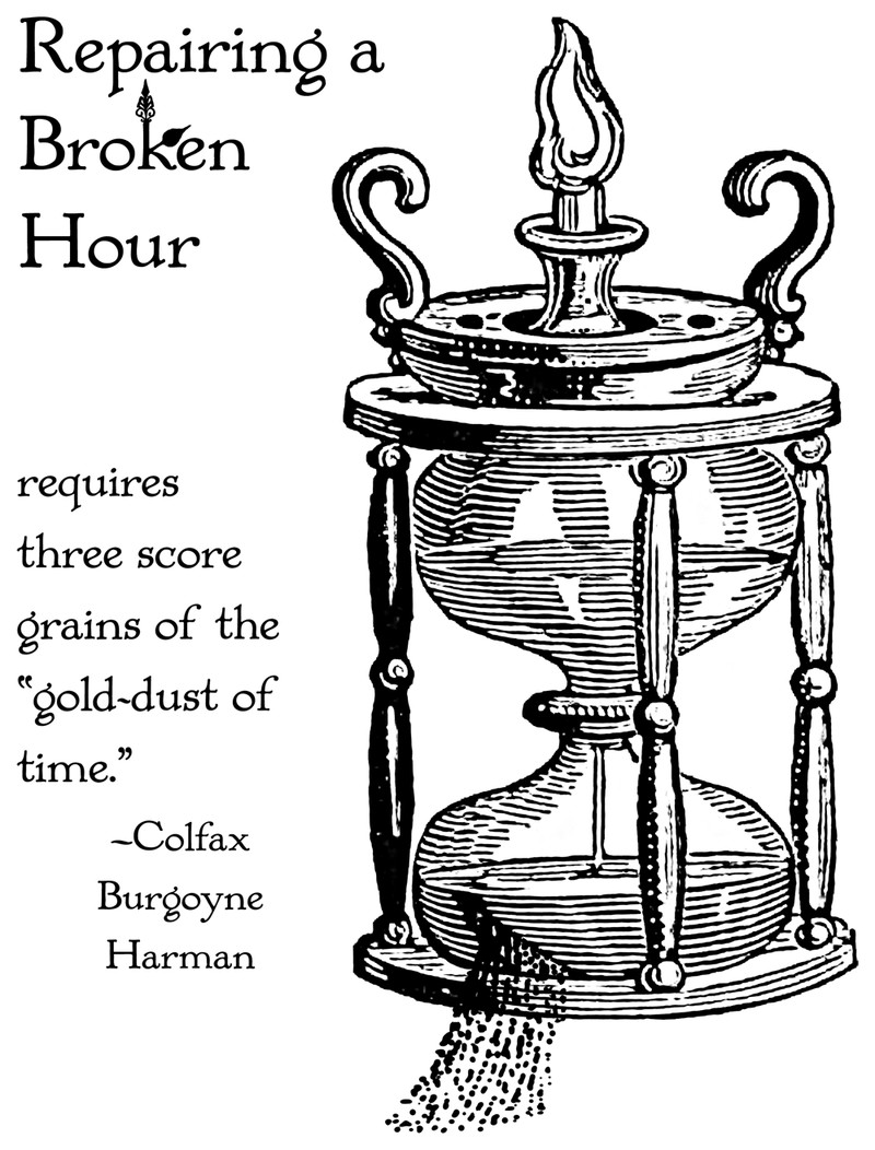 "Repairing a broken hour requires three score of the 'gold-dust of time' —Colfax Burgoyne Harman."  [For Karl.]
