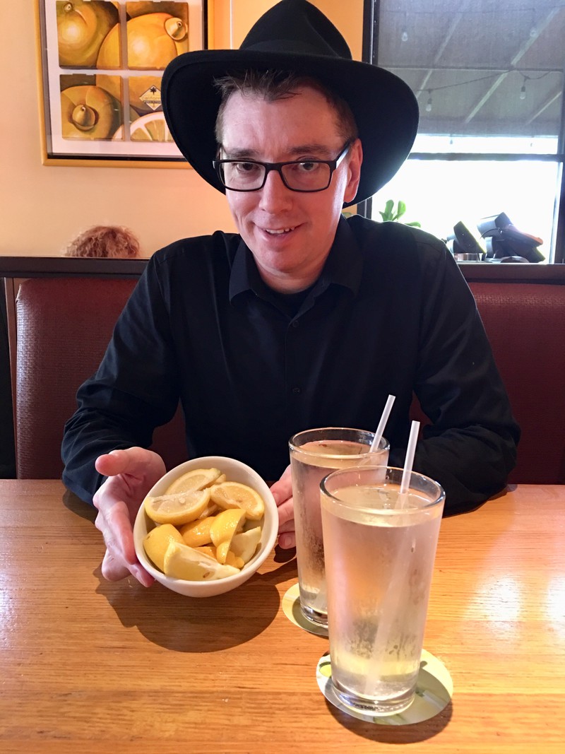 Even better than eating a Lynchian meal is for it to cost nothing. To get free food, first of all, arrive at the restaurant looking like you’re somebody or something — but just who or what exactly, nobody knows. Maybe you’re a mystery shopper there to rate the restaurant. Maybe you’re from the regional manager’s office. Maybe you’re a celebrity. Dress slightly better than the usual clientele would. I choose all-black: a long sleeve black button shirt, black jeans, a fedora (which I wear indoors, against certain schools of etiquette), and a very mysterious brass belt buckle featuring an occult-looking eye. The all-black attire is an additional subtlety: the servers at my favorite restaurant have an all-black uniform, and I’m subtly putting myself on their wavelength — not one of the difficult customers, the “others,” but rather “one of them.” Also, dressing up a bit shows respect for the establishment and for the service, and that makes a huge difference in how you’ll be treated. Having come in respectfully, you’ll be respected in turn. I’ve had managers visit my table and comp my entire meal, not sure who I was but hedging their bets that I’m “somebody.”
