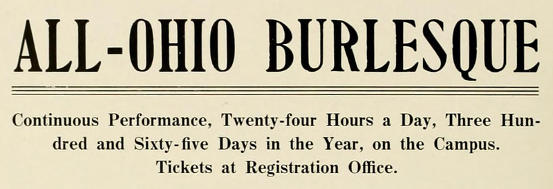 "All-Ohio Burlesque. Continuous performace, twenty-four hours a day, three hundred and sixty-five days in the year, on the campus." From Ohio University's 1915 yearbook.