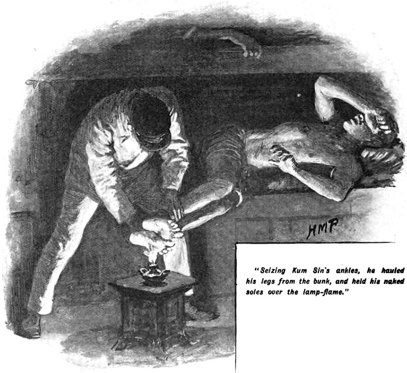 An illustration from a 1908 issue of Pall Mall magazine. The caption reads: "Seizing Kum Sin's ankles, he hauled his legs from the bunk, and held his naked soles over the lamp-flame."