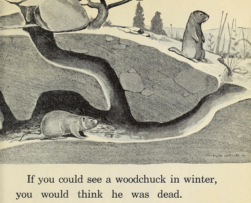 "If you could see a woodchuck in winter, you would think he was dead."  From Changes All Around Us by Craig & Baldwin, 1940.