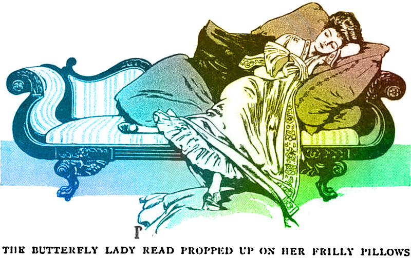 "The butterfly lady read propped up on her frilly pillows."  From Cosmopolitan, 1908.