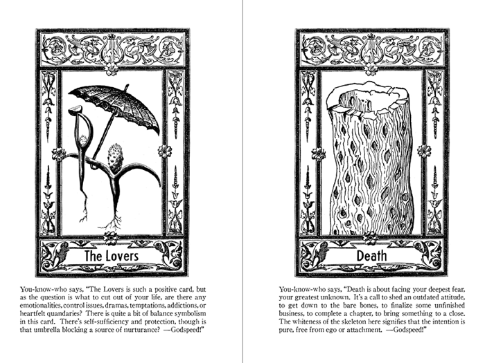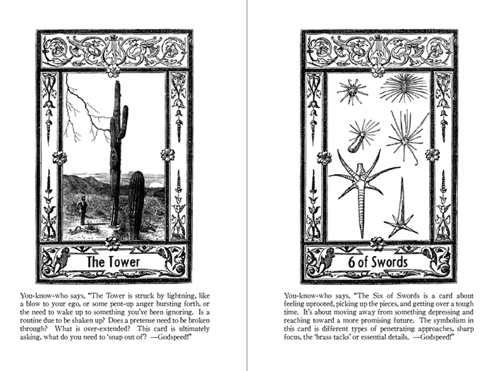 Cards from a hitherto unseen Cactus Tarot appear in the choose-your-own-adventure puzzle book entitled This Book is a Cactus. Indeed, a tarot reading got planted among prickly logic puzzles, riddles, mathematical conundrums, and word enigmas.