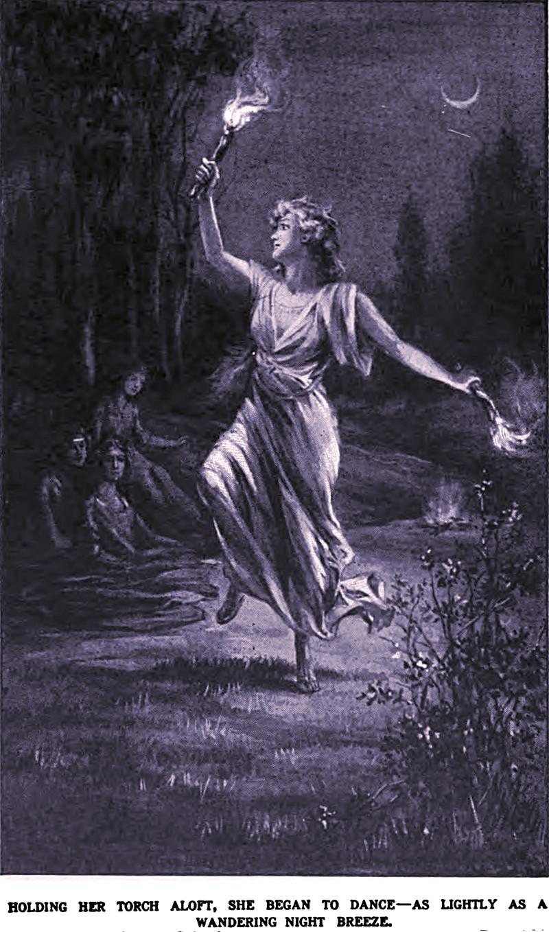 "Holding her torch aloft, she began to dance—as lightly as a wandering night breeze." From The Camp Fire Girls at School by Hildegarde Gertrude Frey, 1916.