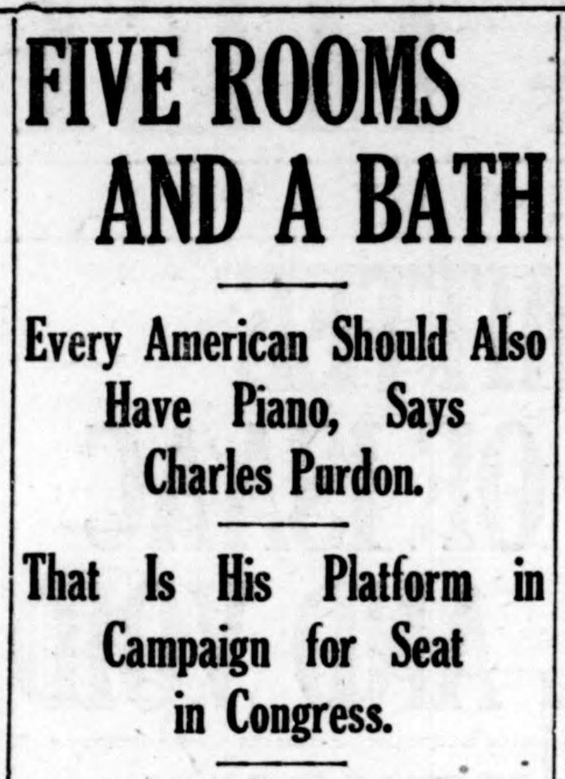 Campaign promises sure have changed.  This would-be congressman promised every American a piano, five rooms, and a bath.  From the Duluth Herald, 1911.