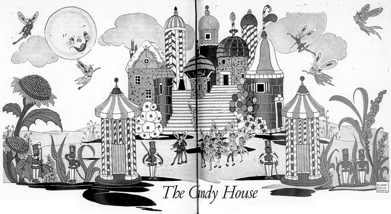 What a surprising old advertisement for milk -- when nibbling on a witch's candy house, don't forget to drink milk. That way you'll have stronger bones and vitality when the witch lures you into her stove. From Purple Parrot, 1924.