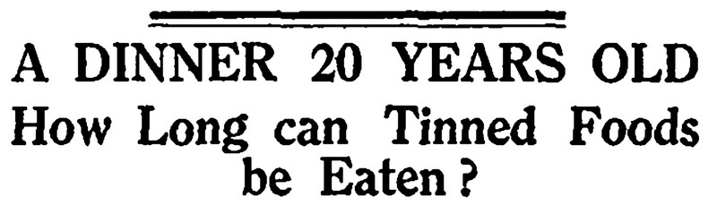 "A dinner 20 years old.  How long can tinned foods be eaten?"  From The Children's Newspaper, 1922.