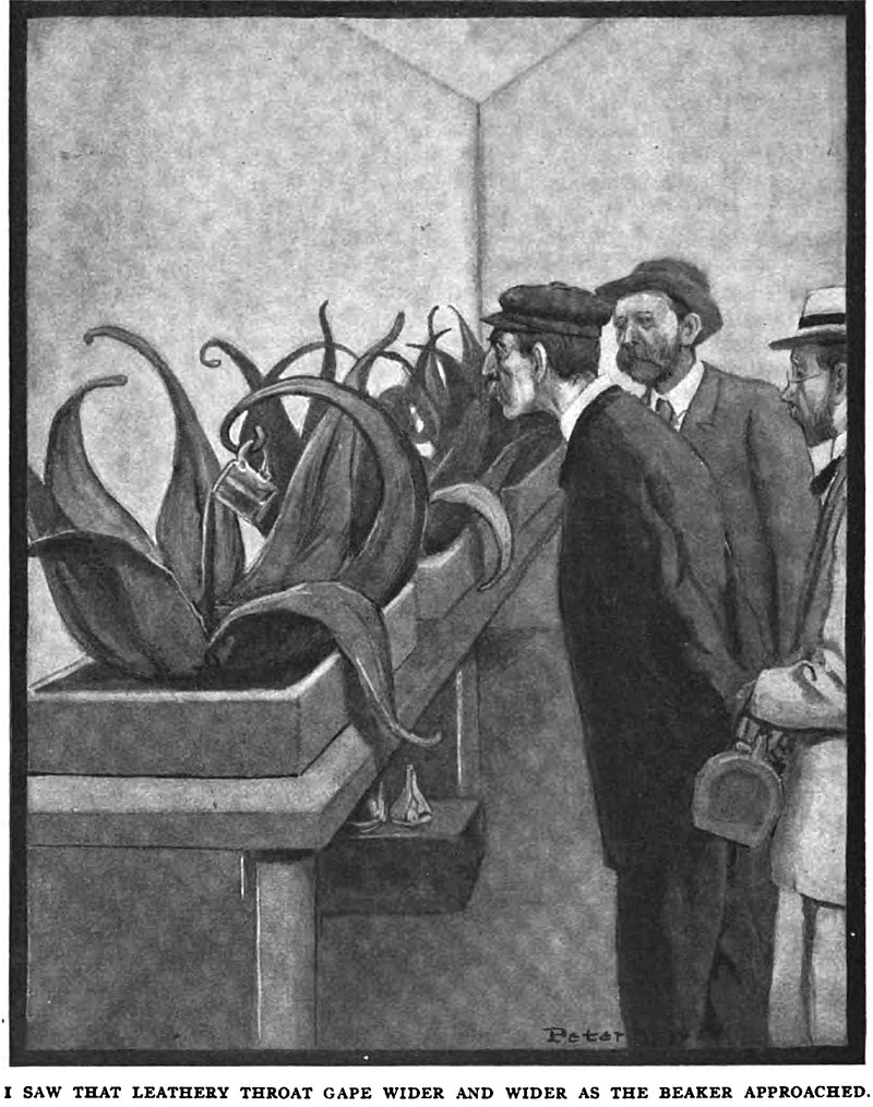 "I saw that leathery throat gape wider and wider as the beaker approached."  From Everybody's Magazine, 1909.