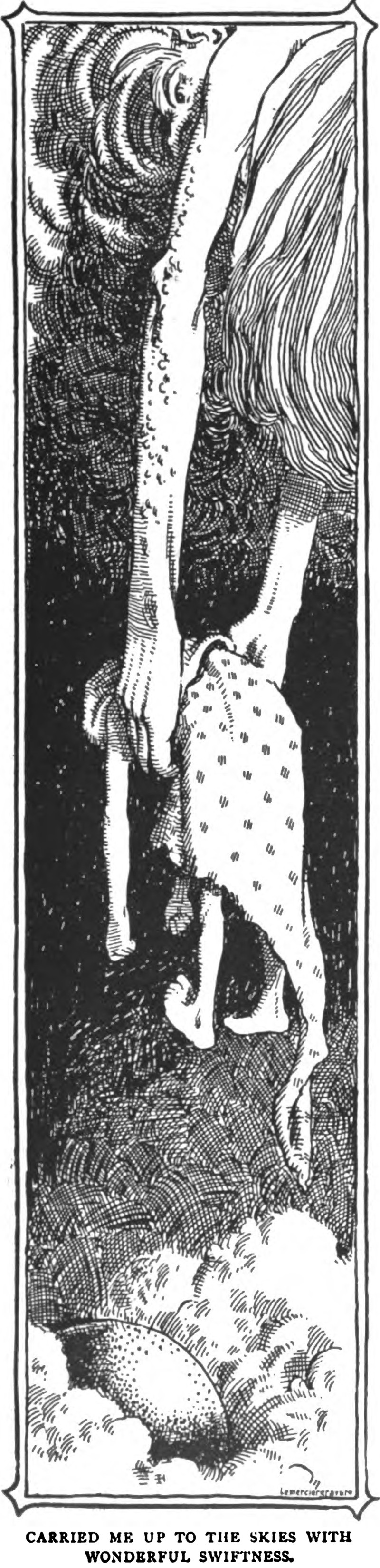"Carried me up to the skies with wonderful swiftness."  From The Arabian Nights Entertainments, 1899.