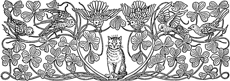#vintage illustration #cat #birds #cat bird seat #in clover #illustration