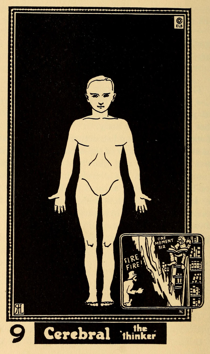 The Cerebral type: "the thinker."  From How To Analyze People On Sight Through the Science of Human Analysis: The Five Human Types by Elsie Lincoln Benedict and Ralph Paine Benedict, 1921.