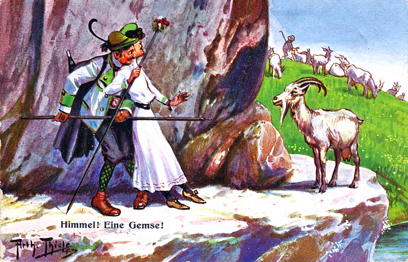"You shall not pass," the chamois isn't actually saying.  Here's some ovinaphobia by Arthur Thiele, date uncertain.
