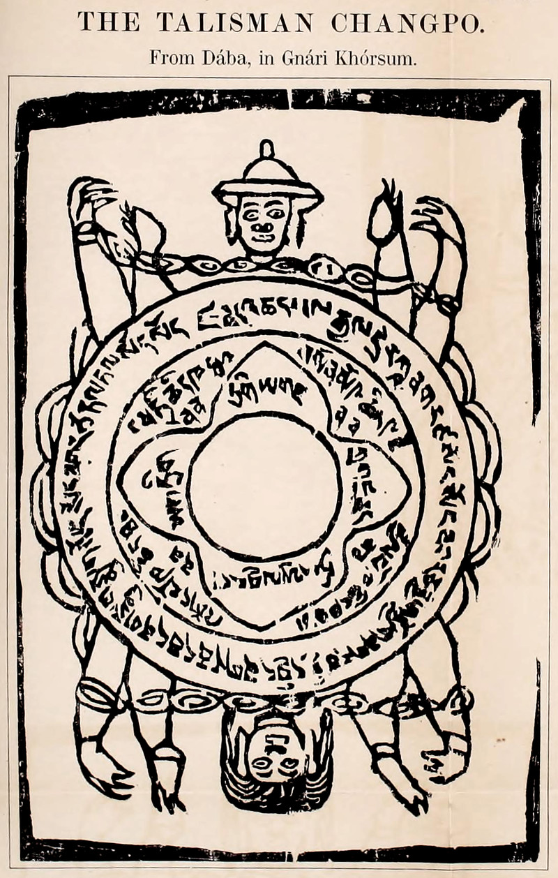 "This talisman, which means 'the keeper, the holder,' is believed to protect man from the machinations of the evil spirits and to enable those who hang it up in their houses, or who wear it as an amulet, to resist the temptations to sin prompted by these demons. The form of this talisman is circular. In the centre is a smaller inner circle; in a second, larger circle is traced a star, and along the inner side of this circle and in the eight intersectional compartments formed by the corners of the star are inscribed the names of hostile spirits. Outside the circles are seen a male and a female, the arms of the one figure tied with chains to the feet of the other." From Buddhism in Tibet by Emil Schlagintweit, 1863. See Strange Talismans for Strange Times.