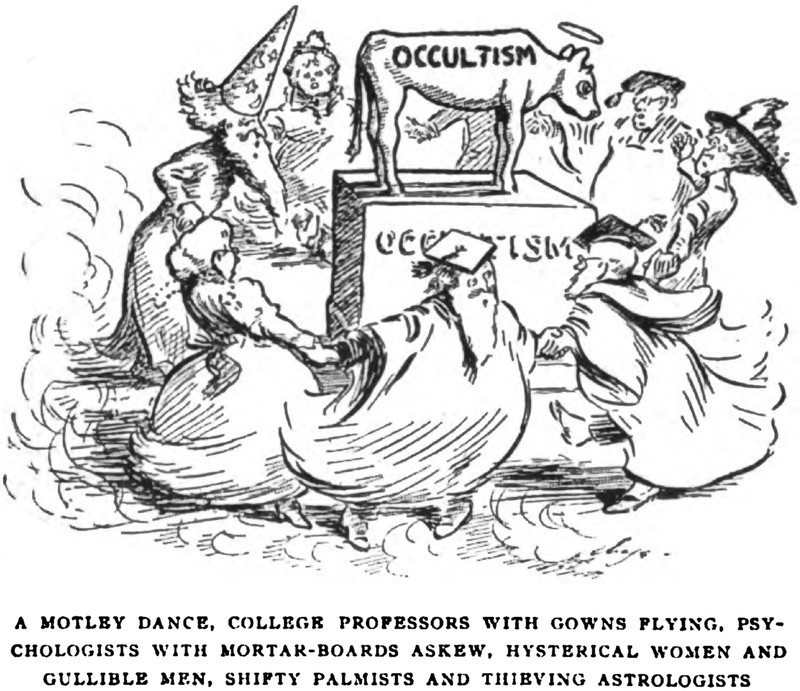 "A motley dance, college professors with gowns flying, psychologists with mortar-boards askew, hysterical women and gullible men, shifty palmists and thieving astrologists." From Pearson's, 1908.
