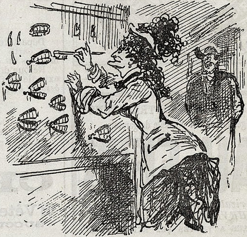 A picnic basket for feeding the chattering teeth.  From Le Charivari, 1878.
