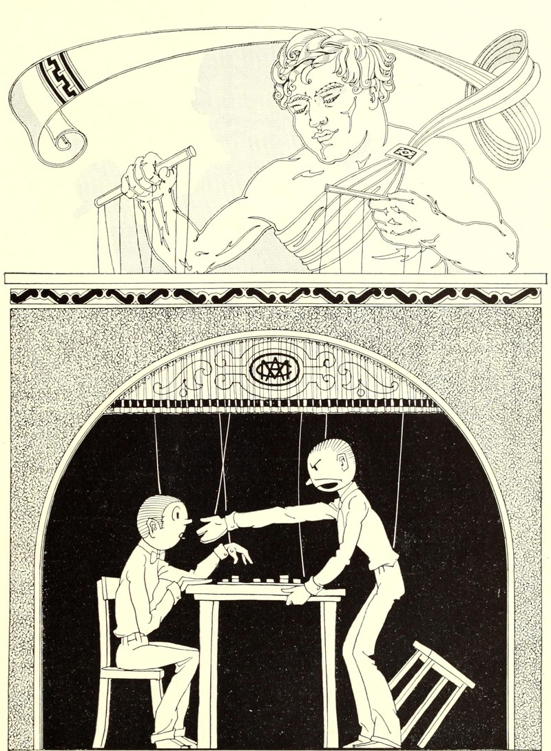 David Levin has said that "The real contest is how we play against ourselves. There's always that other side of each of us, pulling us down." The caption of our illustration reads, "He was annihilated every game." It's from A Ramble Round the Globe by Baron Dewar, 1894.