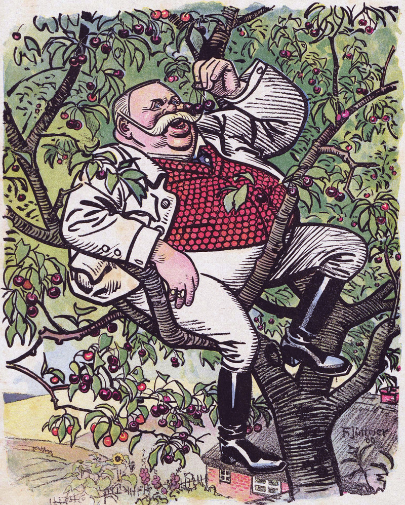 This is the correct vest for eating freshly-picked cherries.  From Lustige Blätter, 1906.