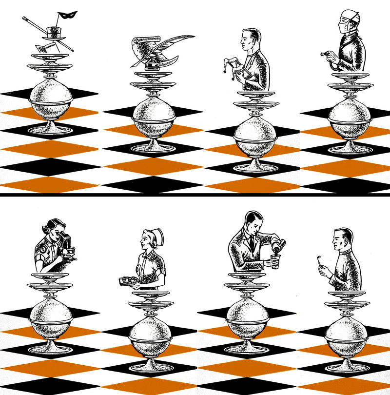 A collage of chessmen from Medical College of Virginia's 1957 yearbook.  See If a Chessman Were a Word: A Chess-Calvino Dictionary.