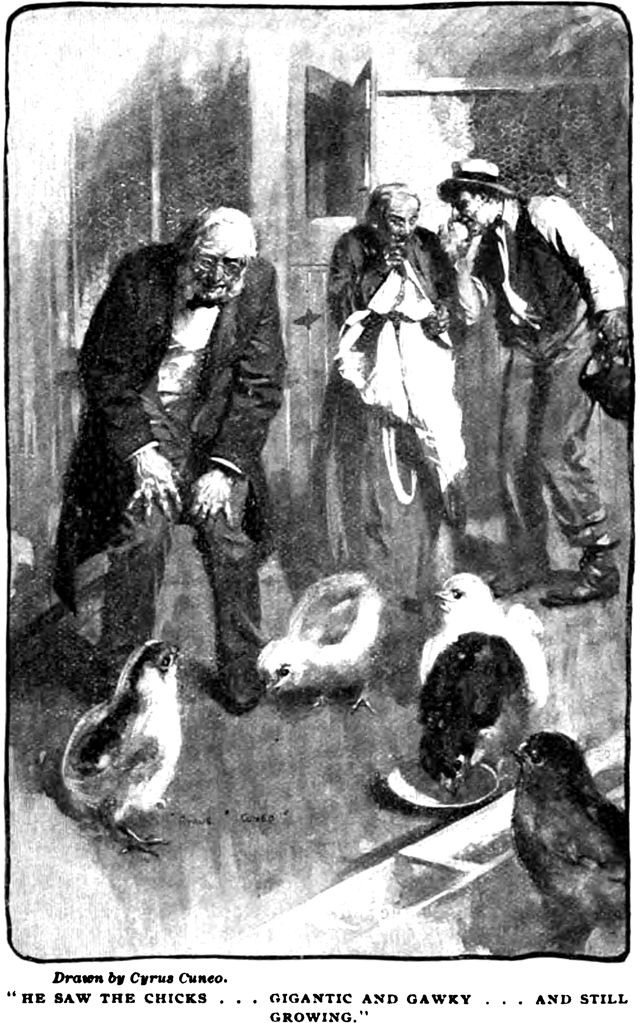 An illustration from a 1903 issue of Cosmopolitan magazine. The caption reads: "He saw the chicks ... gigantic and gawky ... and still growing."