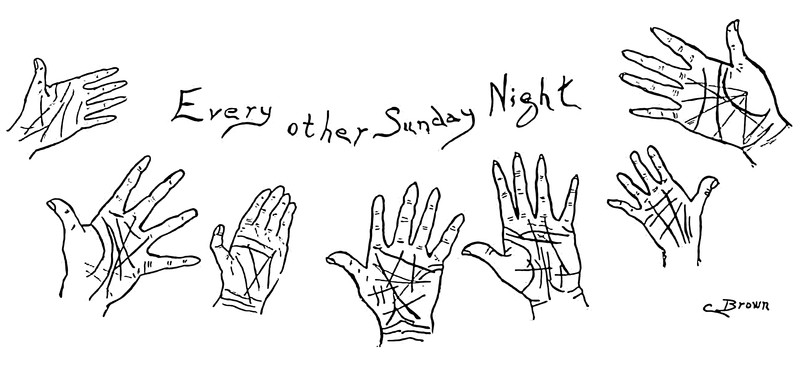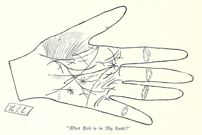 "What evil is in my hand?"  From Winthrop University's 1898 yearbook.  See Crossroads Chiromancy: The Secrets of the Glowing Red Hands.