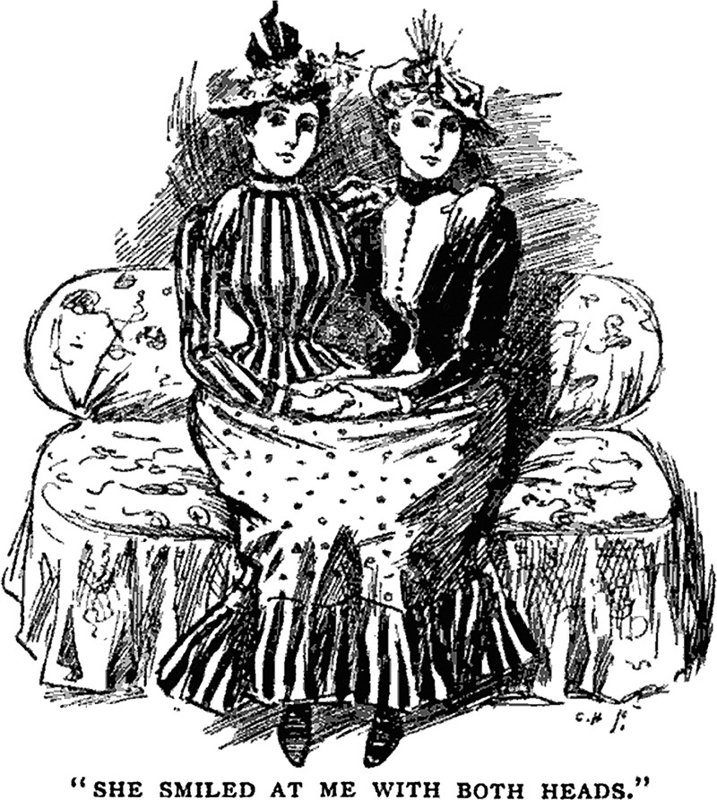 "She smiled at me with both heads."  From Among the Freaks by William Livingston Alden, 1896.