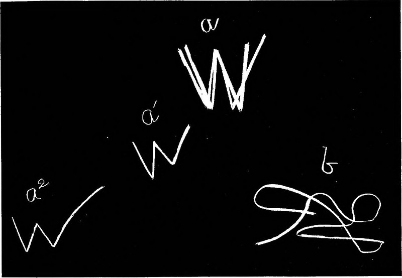 The caption to this figure identifies the three w's as being written by a monkey. The other squiggle is unidentified, but we can now reveal it to be a translation of a Sapphic fragment defined by its decline into silence. From The Evolution of Animal Intelligence by Samuel J. Holmes, 1911.