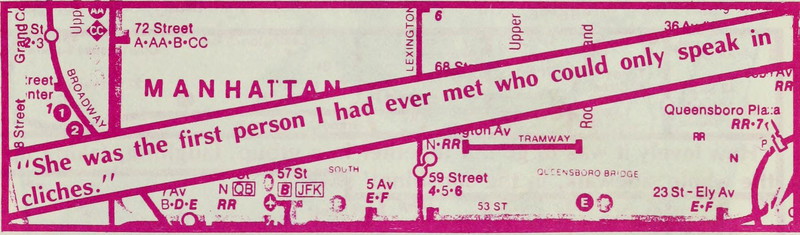 "She was the first person I had ever met who could only speak in cliches."  From Processed World, 1982.