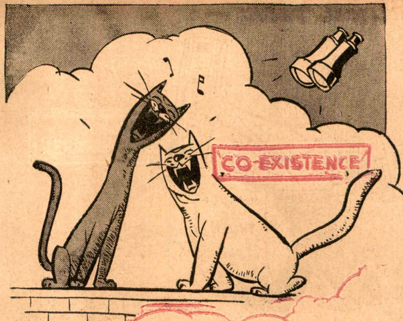 Reblog if you, too, have suckled from the bottle of coexistence only to be rudely surprised.  From Nebelspalter, 1958.