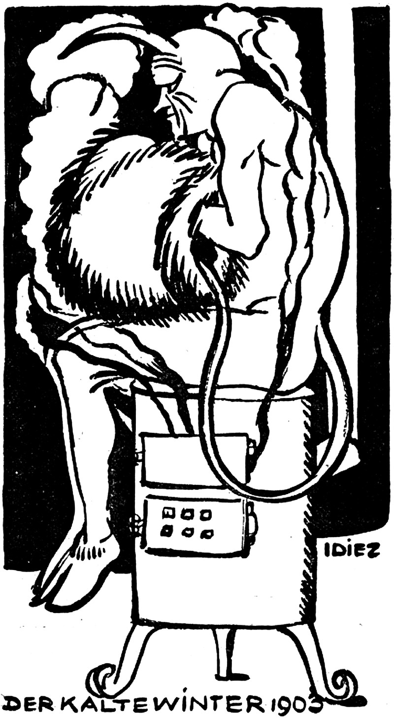 A cold day in Hell. From Jugend, 1903. Speaking of which, what exactly are a snowball's chances in hell? See A Snowball's Chance in Hell.