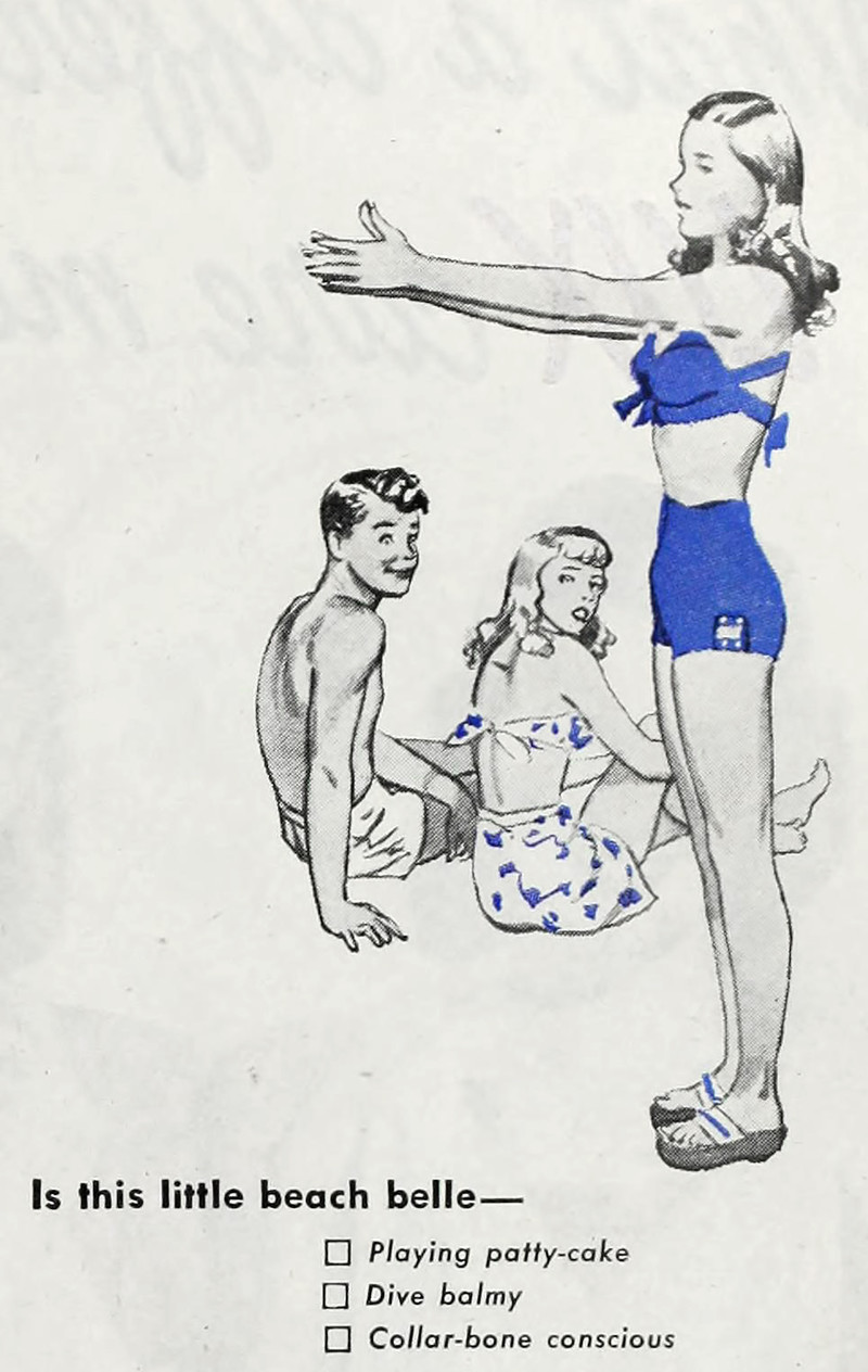 Is she playing patty-cake, dive balmy, or collar-bone conscious?  From The Ladies' Home Journal, 1945.