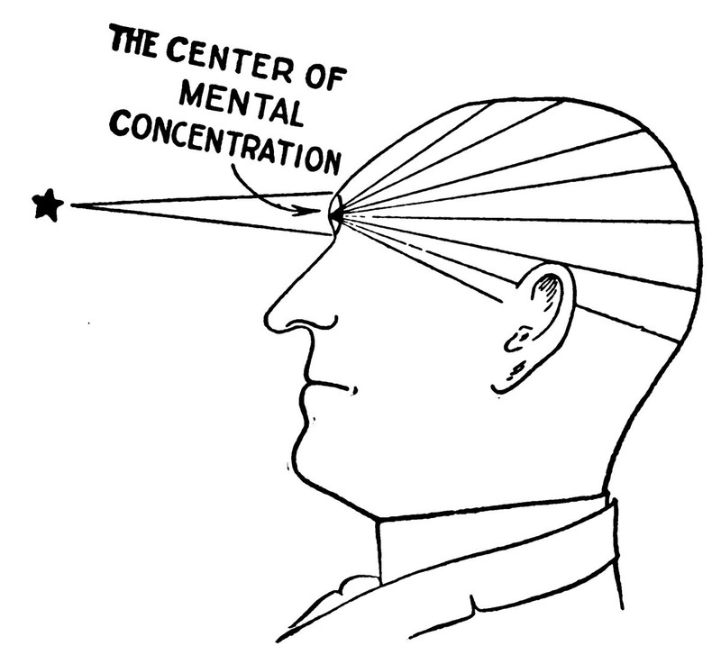 An illustration from a 1912 issue of Hampton's magazine.  The caption reads: "Concentrate thought on a given matter."