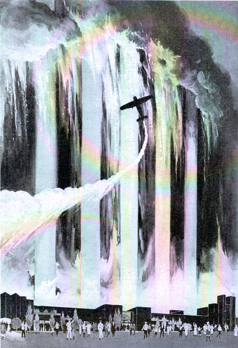 An airplane dumps chemicals to be illuminated over Chicago's Century of Progress Exposition.  From Popular Mechanics, 1932.