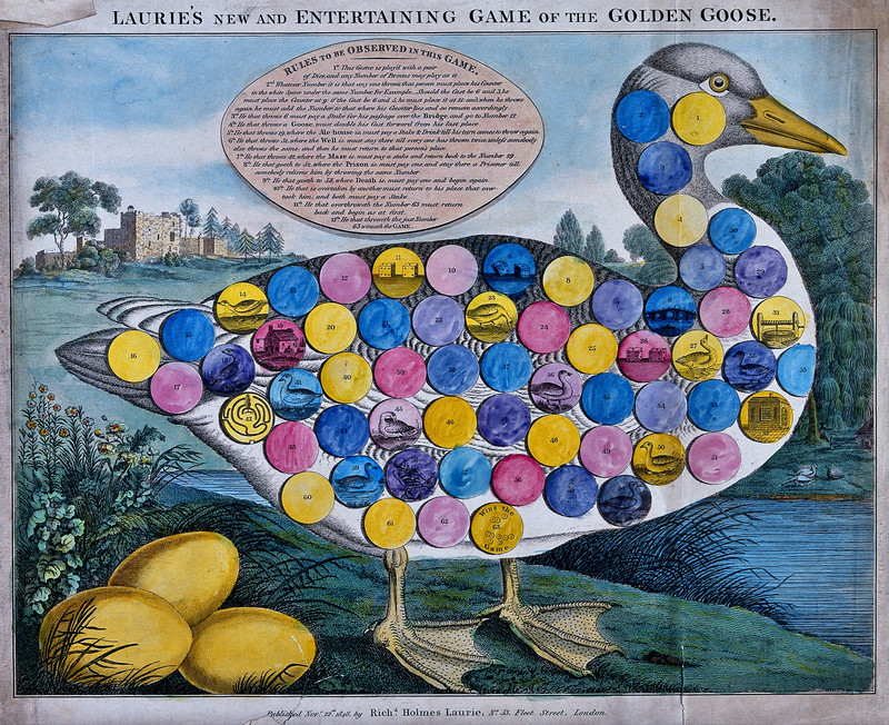 "A large goose with three golden eggs. Numbered circles printed on the body of the goose are for playing a counter game. Coloured engraving." From 1848.