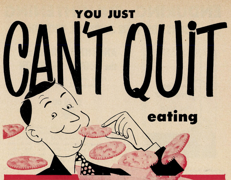 #vintage illustration #vintage ad #gluttony #vintage headline #illustration #crackers #food #headline #1950s #eating #ad