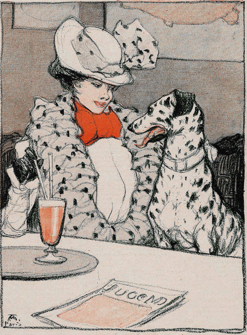 Here's a precursor to Cruella de Vil, over half a century before Dodie Smith's 1956 novel The Hundred and One Dalmatians.  From Jugend, 1900.