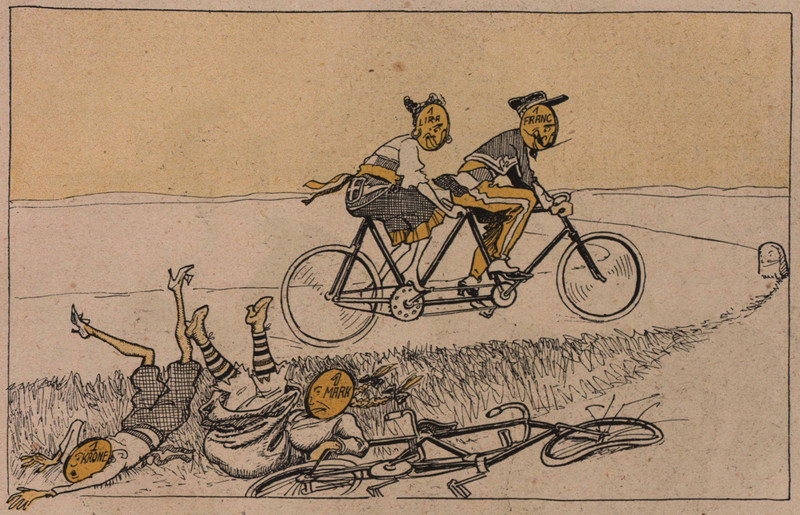 #vintage illustration #bicycle #money #anthropomorphism #cycling #bicycle built for two #1920s #illustration #currency #bike race