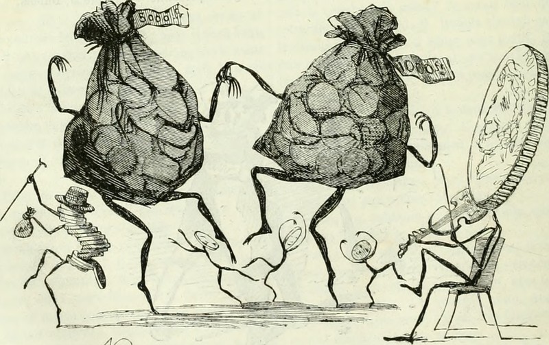 #vintage illustration #money #anthropomorphism #fiddler #dancing money #moneybags #illustration #art #1840s