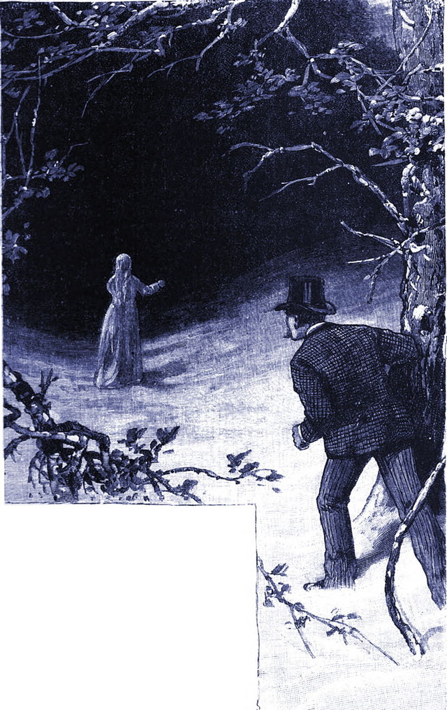 An illustration from an 1896 issue of English Illustrated magazine. The caption reads: "I stumbled to my knees; but something held me—something which bound me like a web in a thousand strong silky meshes."