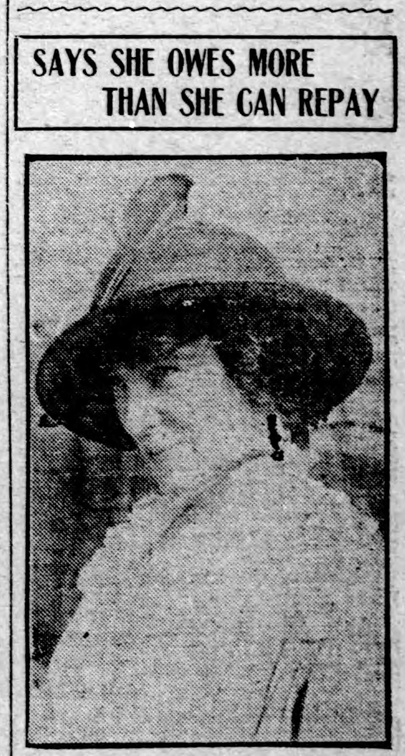 "Says she owes more than she can repay."  From The Duluth Herald, 1913.