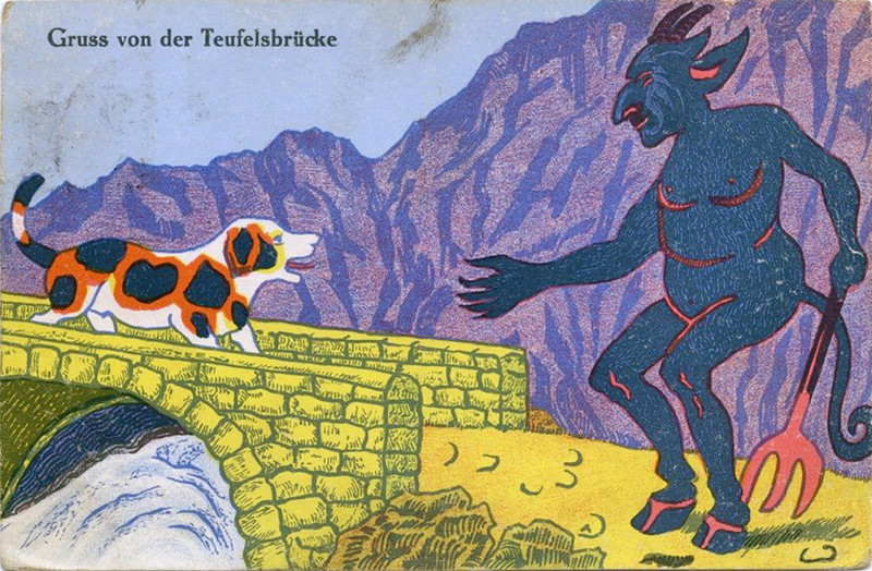 Here's Switzerland's Teufelsbrücke ("Devil's Bridge"), the construction of which was attributed to the Devil (who received the first thing to pass the bridge in exchange for his help. The people of the valley sent a dog across to trick him.)