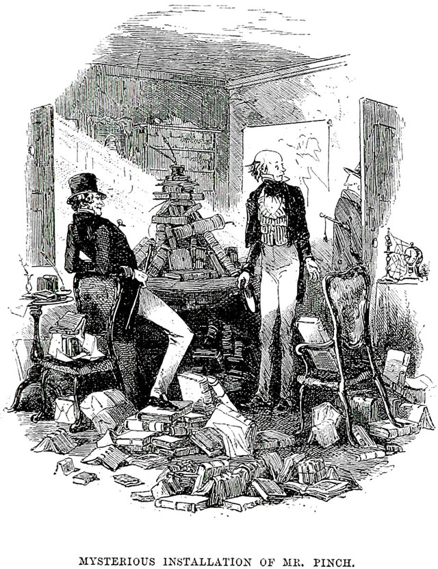 An illustration from The Letters of Charles Dickens (1893).  The caption reads: "Mysterious installation of Mr. Pinch."